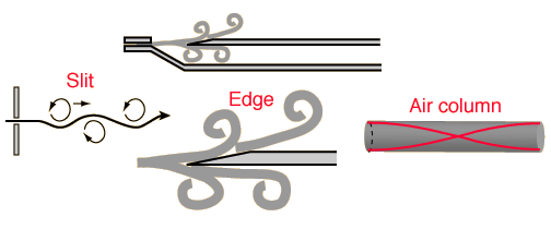Тази струя /или вятър/, срещайки по пътя си остър ръб, се превръща във вятърно махало с постоянно-периодично и равномерно формиране на краткотрайни вихри, предизвикващи музикален тон. По същия начин можем създадем звук вдухвайки струя върху ръба на чаша, бутилка, лист хартия или друг твърд ръб. От емпиричен опит знаем, че звукът може да бъде по-висок или по-нисък, според празното пространство в чашата между повърхността на течността и ръба ѝ. Ако сме наблюдателни ще открием, че височината на тона зависи частично и от някои други условия. Нека да се върнем към добре оформената гладка, дълга и относително тясна органова тръба. Схемата на конструкцията на една лабиална тръба и вихрите са показани на фиг.1 и 2. ![]() |